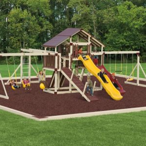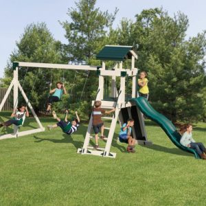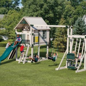For kids who like to play house or camp out, this play set offers a play fort accessible via a safety ladder or a wide climbing platform. This swing set comes with many accessories which include a rock wall/ladder chain combination, two tire swings, and a gangplank to name a few!