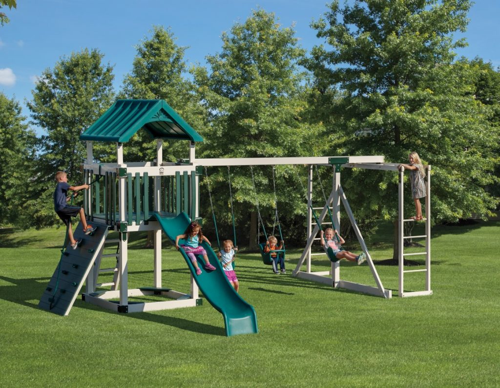Bring the thrill of a wonder wave slide to your own backyard with this multi-functional play set. Using the finest poly roof lumber and heavy-duty hardware, this play set will last through childhood and beyond. Additional features include a play fort with safe-entry ladder and a sandbox for added entertainment and storage. Two rubber-coated swings, a hight back baby swing, and a space saver monkey bar.