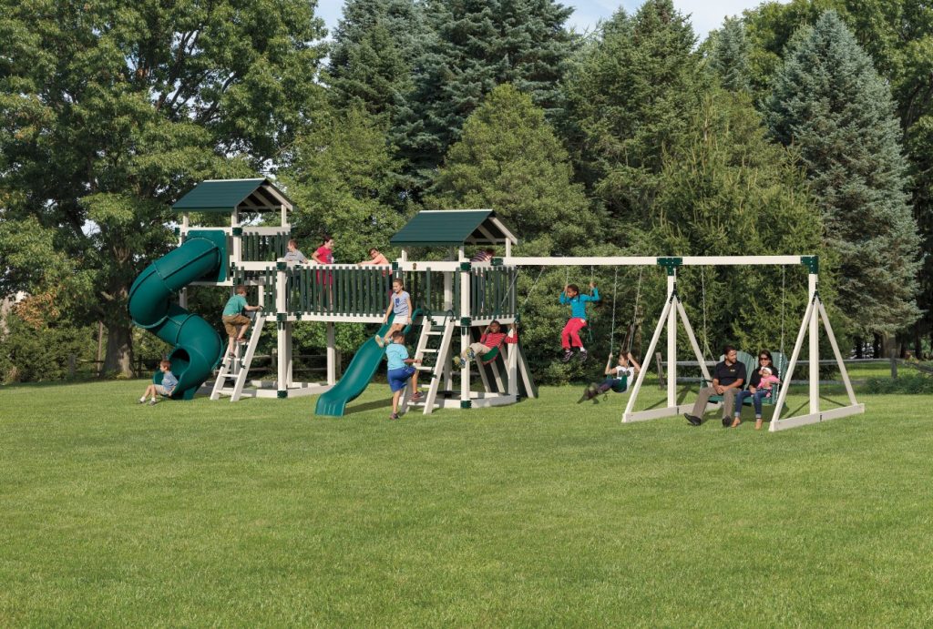 Busy kids need lots of options. This play set has it all with two play forts connected by a sturdy walking bridge. A climbing platform leads up to a dual deck fort with a twisty turbo slide for easy exit. Two safety ladders ensure secure entrance into each fort, which sports two sandboxes below each floor. Heavy duty rubber swings and a trapeze bar complete this extensive set.
