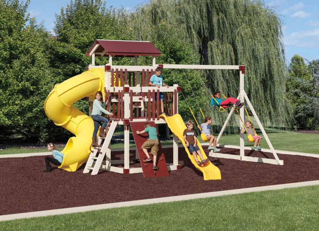 Give kids a reason to head outside with this bi-level fort handcrafted with pressure-treated wood and the finest hardware. Two sliding options are perfect for children of all ages and are easily accessible with a safety ladder complete with side handles. An optional sandbox area sits below the fort and two rubber coated swings and a trapeze bar with rings round out the set.