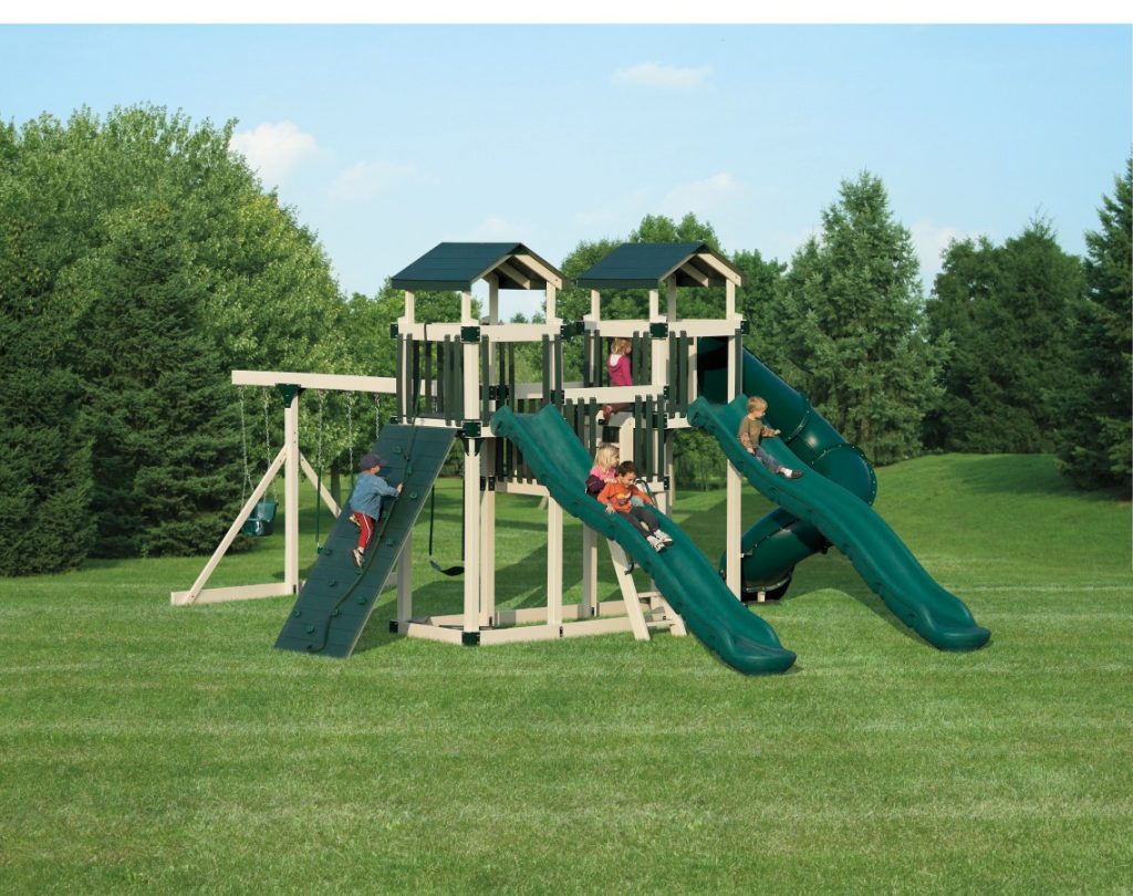 This fortress of fun offers hours of backyard entertainment. Two protective forts are connected by a lower landing to provide added safety and stability. Three slide options give children the opportunity to race on the wavy slides or laugh their way through the curvy tunnel. This deluxe set includes a climbing platform and four swings including a relaxing chair swing. The area below the fort provides ample room for a sandbox or toy storage.