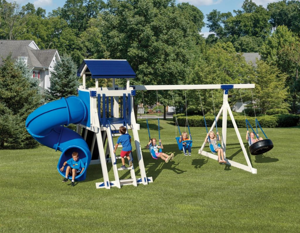 For kids who like to play house or camp out, this play set offers a play fort accessible via a safety ladder or a wide climbing platform. This swing set also comes with a 4-position swing beam, and a 4 chain rubber tire swing.