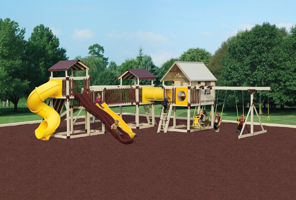 The entire neighborhood can join in the fun with this play set that has everything. A playhouse and two forts offer hours of imaginary playtime. A rope bridge and plastic tunnel allow children to move safely throughout the set and a bubble window provides an entertaining view of the world. Children can choose from three sliding options as well as four swings including seesaw and trapeze features. There are safety ladders strategically located throughout the set along with a rope bridge and climbing platform.